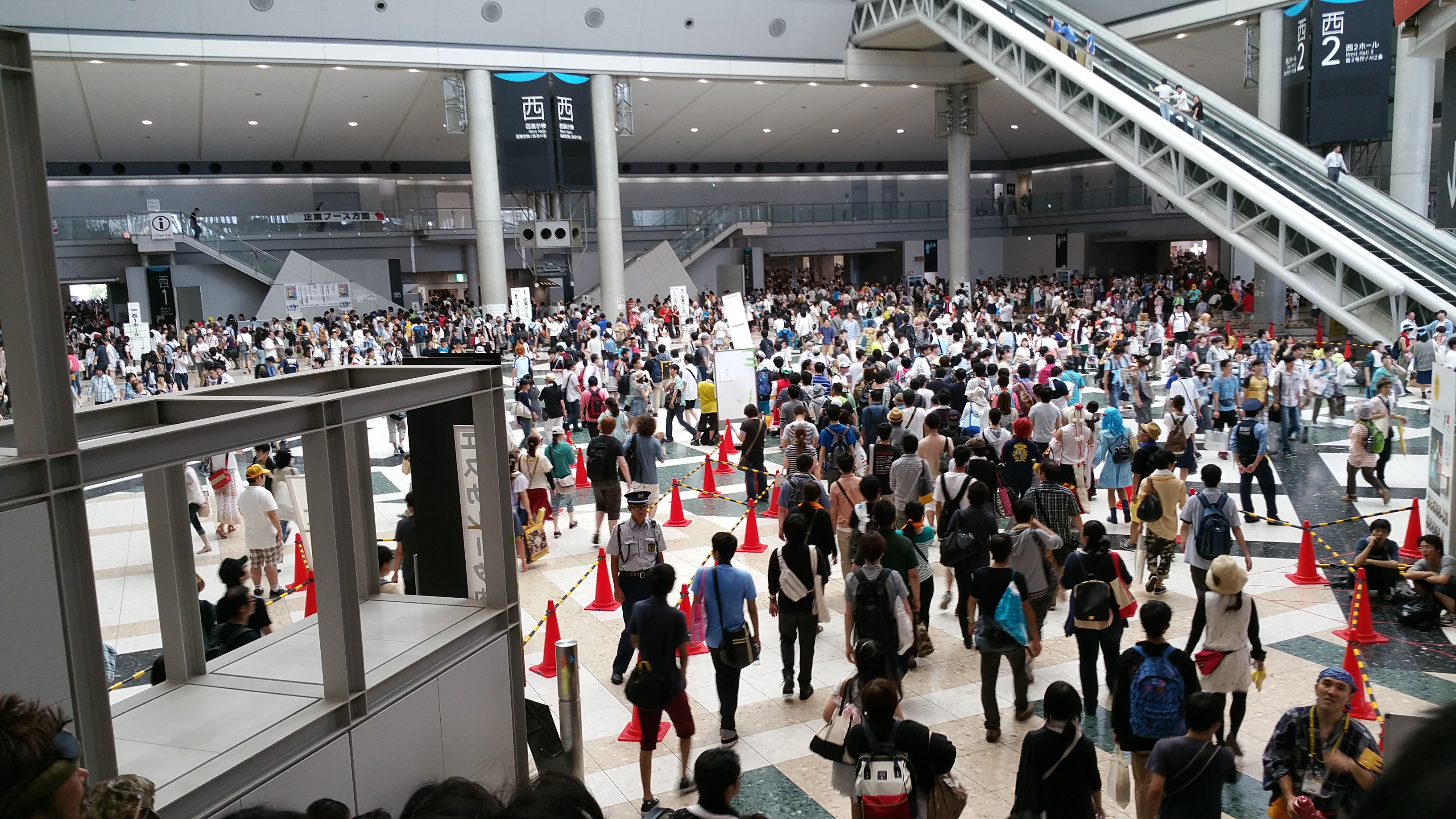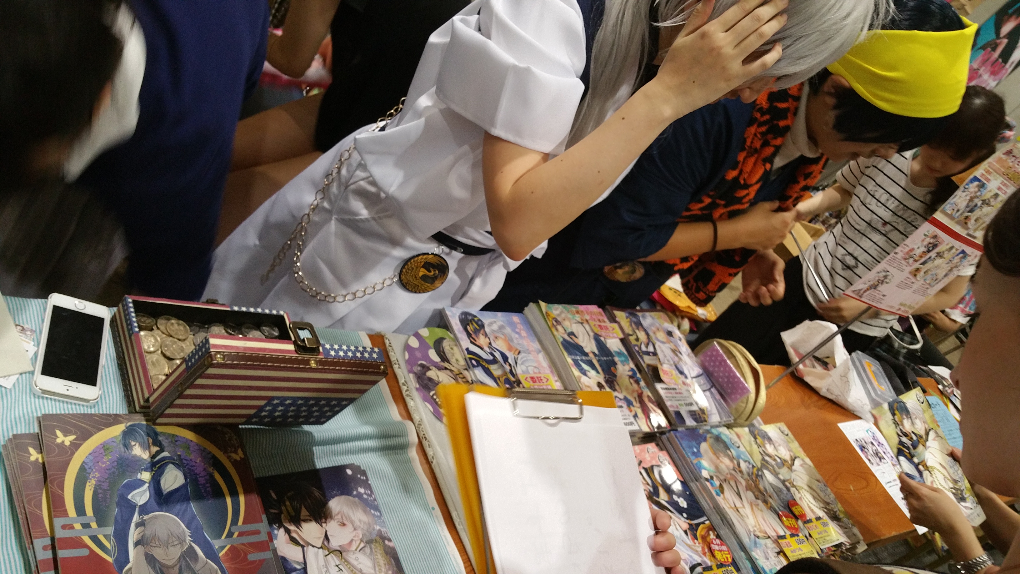 לאחר-מכן נכנסנו לתוך האולם הגדול, שם הובילו אותנו לאזור שמתמחה בדוג’ינשי (יוצרי מנגה צעירים שמפתחים סיפור השאוב מאנימה או מנגה קיימים או מקוריים. העבודה כוללת כתיבת עלילה שונה או שינוי חלק בעלילה הקיימת, וזו בעצם אחת הדרכים להיכנס לתעשיית המנגה ביפן ולצבור פרסום). במסגרת זו, יצא לנו לדבר עם אומנית (או “מנגקה” – צייר מנגה) דוג’ינשי (=לא-מקצוענית) שמכרה את עבודותיה בתערוכה והסבירה לנו מעט על עולם הדוג’ינשי ועל התעשייה מקרוב (את הראיון המלא נית לראות בפייסבוק). כמו כן, ביקרנו גם באזור של יוצרי מנגה מקצועיים אשר מציגים את סדרות האנימה שרצות היום וכן סדרות קלאסיות. כפי שניתן לראות בתמונות, התור היה מאוד ארוך.