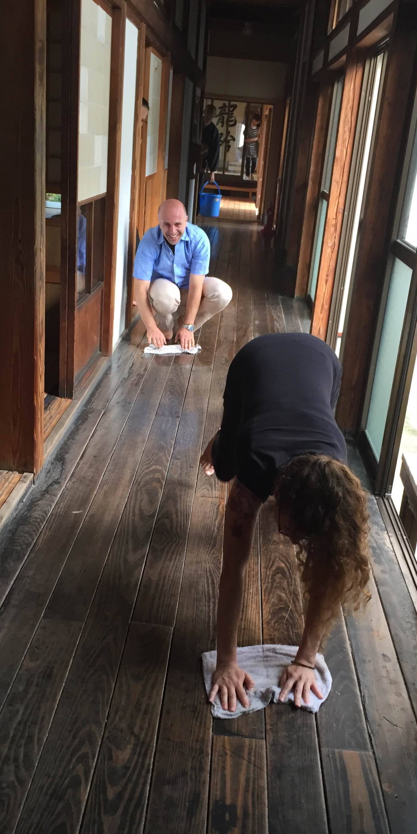הנזיר הבכיר לימד אותנו עשרה עקרונות בבודהיזם שחלקם מוכרים לנו מהיהדות, לדוגמא: “ואהבת לרעך כמוך”. מעבר לכך יש חשיבות לריעות, שמירה על לב וראש פתוח, שיוויון בין המינים, לא לקבל דברים כמובן מאליו וכו’. לאחר חילופי מתנות התחלנו לנקות את המקדש בשיטת דוג’ו (קרדיט לסבינה על התמונות), ידיים על הסמרטוט, “רגליים דוחפות, ורצים קדימה. כמובן שבתחרות עם ניסים, ניצחתי בגדול.