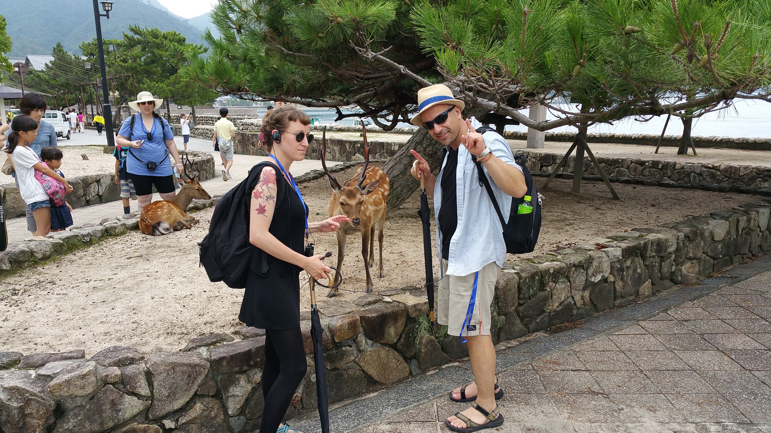 האי מיאג׳ימה ידוע בצבאים הרבים החיים בו עם ולצד בני האדם, שישמחו לכל תשומת לב, במיוחד אם היא כלולה בקבלת אוכל. כבר בתדריך נאמר לנו לא ללכת עם שקיות ודברים שעושים רעש כדי לא לגרום לצבאים להתעניין בנו יתר על המידה. בתרבות היפנית הצבאים מייצגים במקביל את שליחי הקאמי (האל) בשינטו, ובבודהיזם רואים בצבאים אלו שהבודהה נתן את דרשתו הראשונה אליהם. לאחר שהצטלמנו בזהירות ובנחישות על רקע שער הטוריי ובחברת צבי שהיה נראה מעוניין מדי בבאנר של החוג, המשכנו לטייל באי.