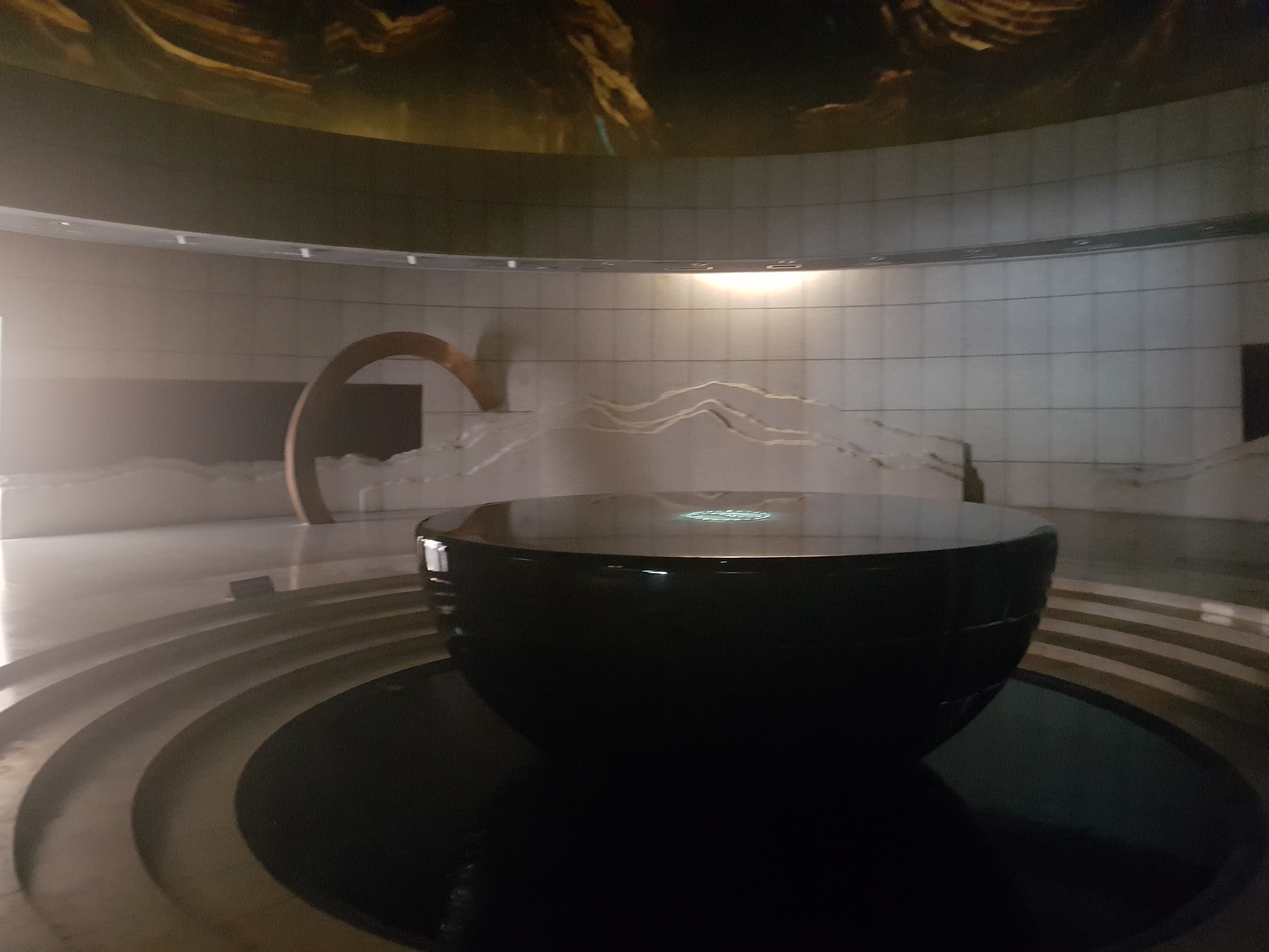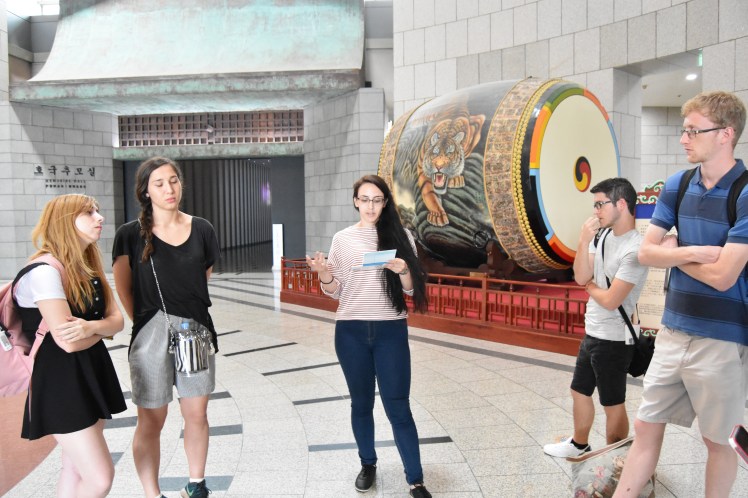 נכנסנו למוזיאון, ולאחר התעניינות של טל במשמעות המבנה והסדר המיוחדים של האולם – קירות עם תבליטים של הרים, במרכז החדר עמדה מעין קערה עם מים זורמים שמעליה היה מקרן שהקרין על מרכז אותה קערה את דגל קוריאה ועל החלק העליון של הקירות הופיע ציור של חבלים קשורים ופרומים. מר פארק סיפר לנו שההרים על הקירות הם בעצם ההרים של כל קוריאה, החבלים מסמלים את הפצע והסבל שנגרמו בעקבות הפירוד של קוריאה כמו שחובשים פצע פתוח והקערה באמצע עם דגל קוריאה במרכזה מסמלת את האיחוד של שתי הקוריאות לאומה אחת.