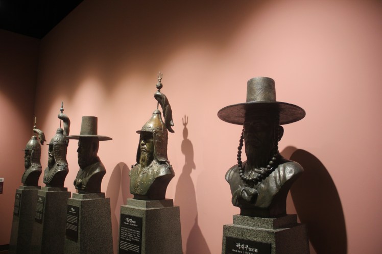 בנוסף לכל, מוצגים פסלים רבים של דמויות היסטוריות חשובות אשר לקחו חלק חשוב במלחמות אלה, חלקן, כמו הגנרל יי סונשין, היו מוכרות לנו יותר מידע קודם וחלקן פחות, אך מה שהיה מעניין לראות הוא שבכל חדר היו מספר פסלים של דמויות הירואיות שכאלה, והרגשנו שיש הדגשה של הירואיזם קוריאני בנרטיב של המוזיאון ככל שהתקדמנו וראינו אותן בכל חדר. נוסף על כך, הוצגו גם פסלים ודגמים של מבנים וכלי מלחמה כבדים אשר נועדו להציג את הדברים בצורה מוחשית וויזואלית יותר. השימוש המרובה בדגמים מסוג זה, שהיו ברובם גדולים יחסית, לחלקם היה קל יותר לגשת, חלקם פחות אך זה תורם להרגשה שהכל נמצא סביבנו באותו הרגע, לא רק בתמונות או טקסט אלא ממש באופן מוחשי. דוגמא טובה לכך שזכורה לנו היטב היא ספינת הצב של הגנרל יי סונשין, שהייתה דגם בגודל עצום, עמדה במרכזו של אולם כשסביבה ספינות מסוגים נוספים מאותה תקופה אך קטנות יותר, מה שהדגיש את החשיבות שמיוחסת לספינה זו, שכן בעזרתה ניצח הגנרל יי סונשין את צבאו של הידאיושי ומנע את פלישתה של יפן לקוריאה באותה העת ועל כן נחשב לגיבור לאומי ודמות הירואית.